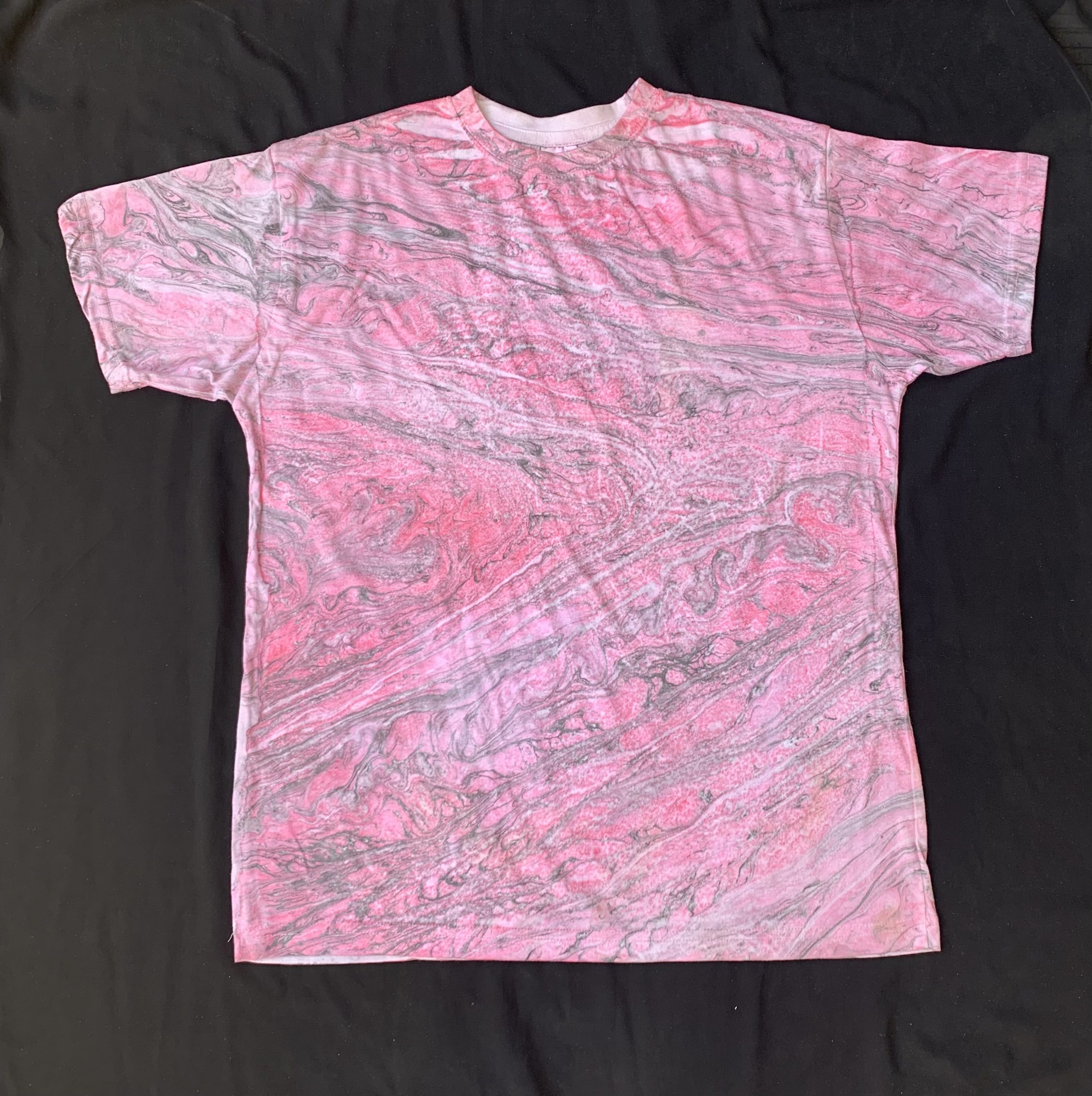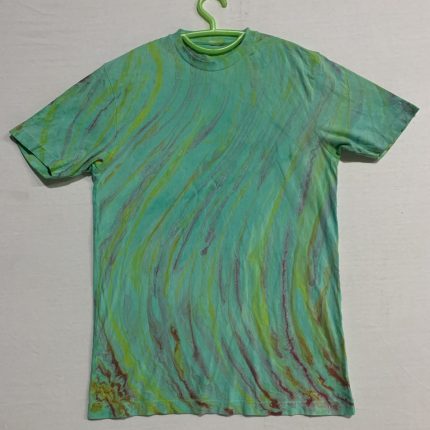 This is one of a kind hand marble T shirt follow the 16 century Turkish EBRU tradition of marbling by floating acrylic atop a viscose Irish moss seaweed liquid, creating an organic pattern as the ink spreads across the liquid surface then captured by carefully placing the fabric atop the thick liquid Vat! You might spot evidence of how this shirt was hand printed by a thin white live along the side from flipping the shirt Vat or a white drip near the back armpit where the liquid seaweed often pools up when rotating the method