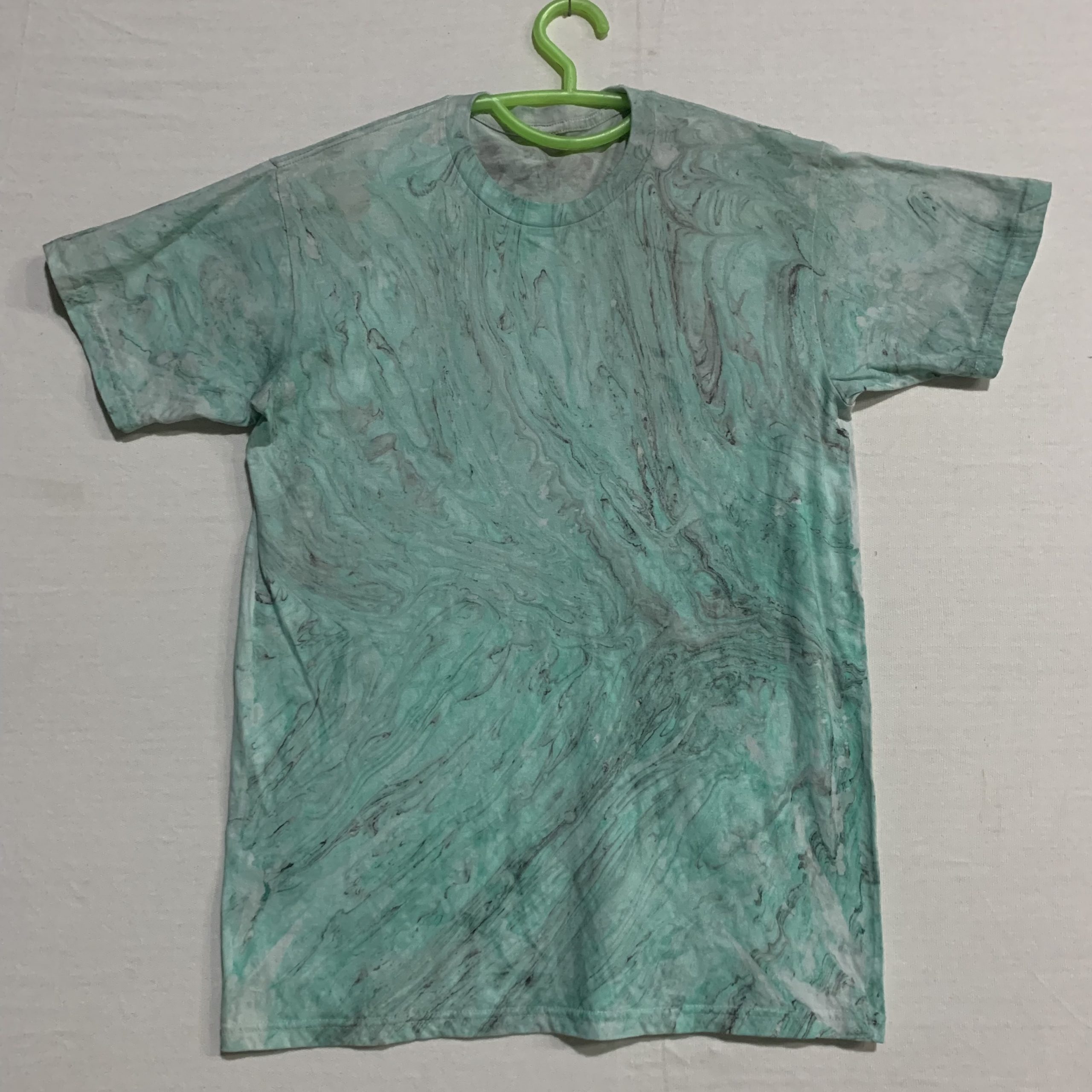 This is one of a kind hand marble T shirt follow the 16 century Turkish EBRU tradition of marbling by floating acrylic atop a viscose Irish moss seaweed liquid, creating an organic pattern as the ink spreads across the liquid surface then captured by carefully placing the fabric atop the thick liquid Vat! You might spot evidence of how this shirt was hand printed by a thin white live along the side from flipping the shirt Vat or a white drip near the back armpit where the liquid seaweed often pools up when rotating the method