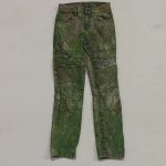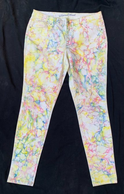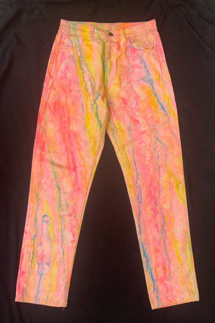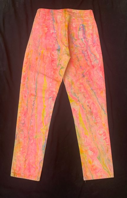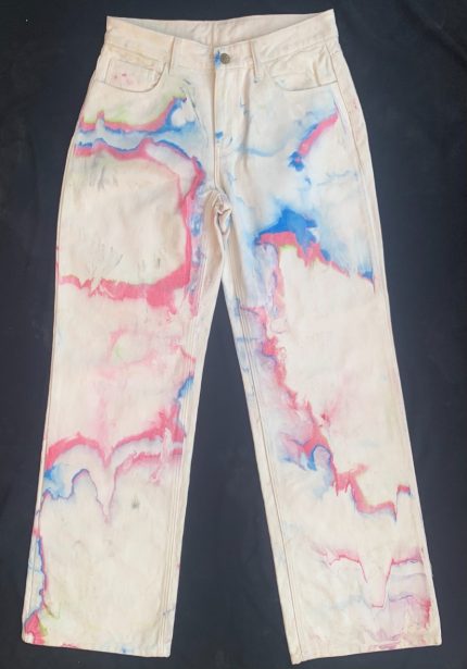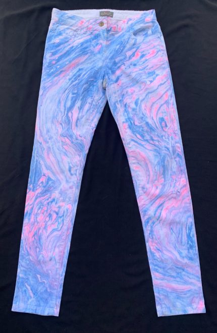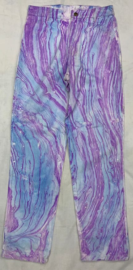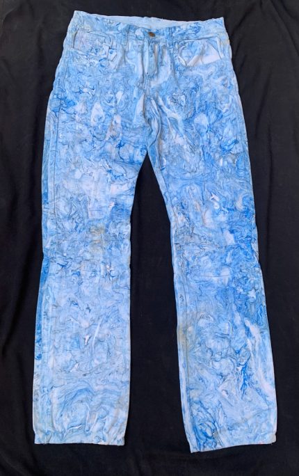 This is one of a kind hand marble Jeans follow the 16 century Turkish EBRU tradition of marbling by floating acrylic atop a viscose Irish moss seaweed liquid, creating an organic pattern as the ink spreads across the liquid surface then captured by carefully placing the fabric atop the thick liquid Vat! You might spot evidence of how this jeans was hand printed by a thin white live along the side from flipping the jeans Vat or a white drip near the fly where the liquid seaweed often pools up when rotating the method