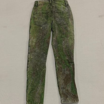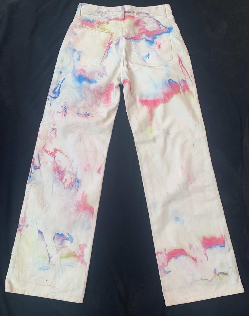 This is one of a kind hand marble Jeans follow the 16 century Turkish EBRU tradition of marbling by floating acrylic atop a viscose Irish moss seaweed liquid, creating an organic pattern as the ink spreads across the liquid surface then captured by carefully placing the fabric atop the thick liquid Vat! You might spot evidence of how this jeans was hand printed by a thin white live along the side from flipping the jeans Vat or a white drip near the fly where the liquid seaweed often pools up when rotating the method