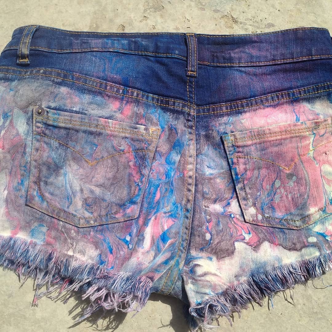 This is one of a kind hand marble Denim shorts follow the 16 century Turkish EBRU tradition of marbling by floating acrylic atop a viscose Irish moss seaweed liquid, creating an organic pattern as the ink spreads across the liquid surface then captured by carefully placing the fabric atop the thick liquid Vat! You might spot evidence of how this denim shorts was hand printed by a thin white live along the side from flipping the denim shorts Vat or a white drip near the fly where the liquid seaweed often pools up when rotating the method